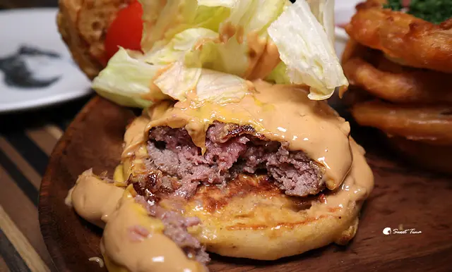 花生醬牛肉滿福堡 - 選擇的配菜是炸洋蔥圈、薯泥,吃完後一樣很有飽足感,喜歡牛肉漢堡的人一定要品嚐看看,牛肉好juicy啊~~
