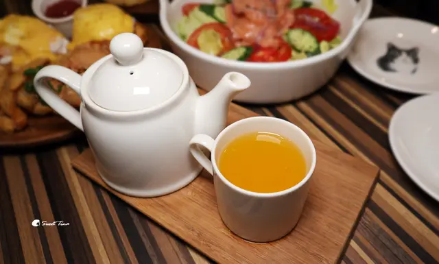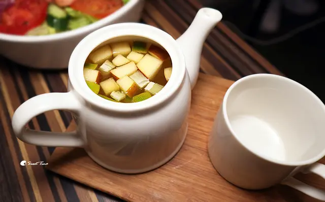 熱水果茶 - 水果茶裡加入了不少水果丁,調配後的甜度不高,喝起來酸度較為明顯,我覺得搭配大份量的早午餐很對味,超解膩。