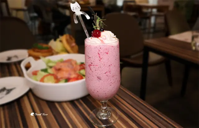 綜合莓果奶昔 - 粉粉的莓果奶昔搭配上貓咪湯匙,超卡哇依的,而且味道調配得也很棒,不甜膩,這杯奶昔我喜歡。