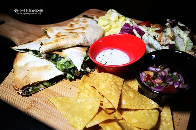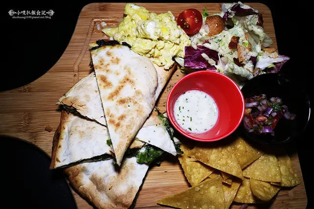 卡莎蒂亞(起司菠菜).炒蛋.玉米片.莎莎醬.凱薩沙拉