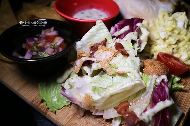 凱薩沙拉,蘿美生菜.紫高麗菜,撒上碎培根,淋上酸甜凱薩醬,搭配一些新鮮時蔬沙拉,感覺營養也均衡