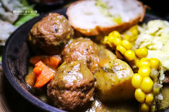 燉肉(燉肉丸).炒蛋.玉米片.烤玉米.凱薩沙拉