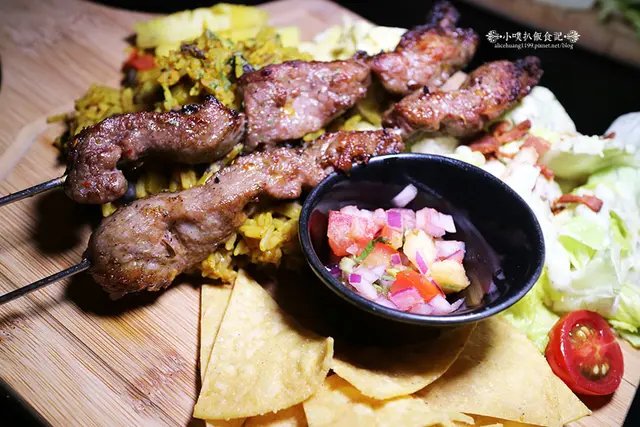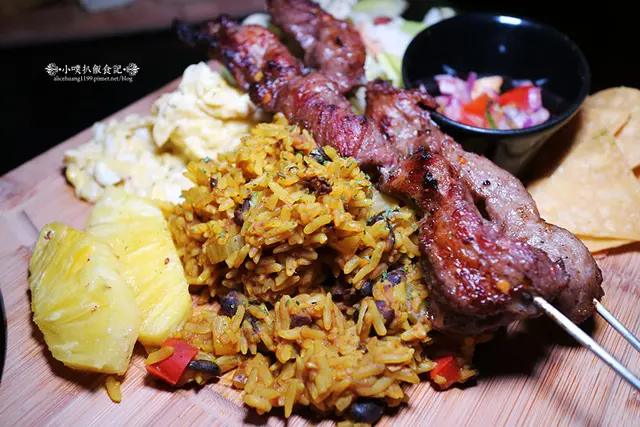 火烤肉串(豬肉串).黑豆飯.炒飯.玉米片.凱薩沙拉