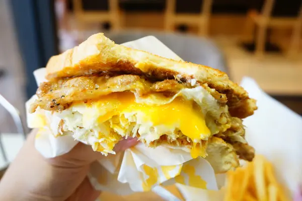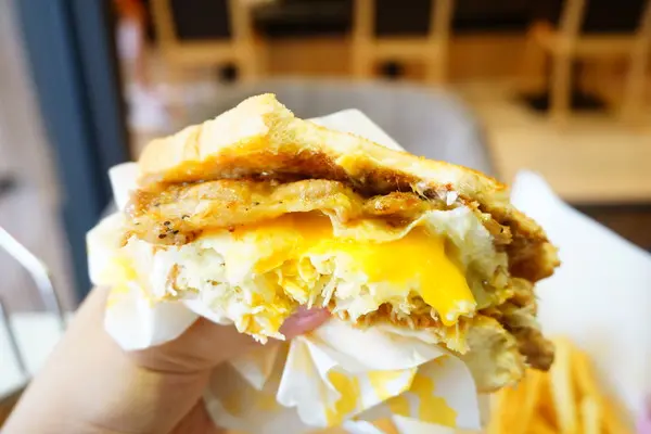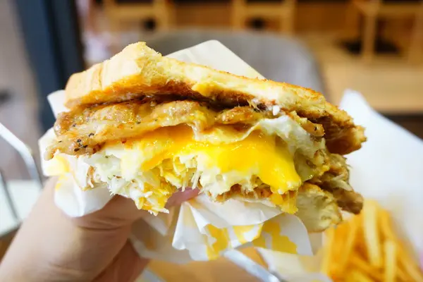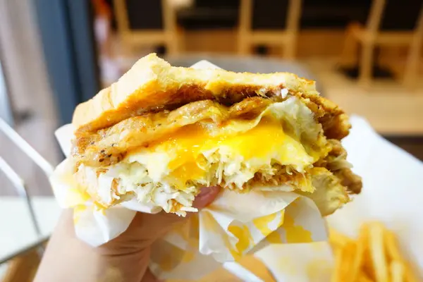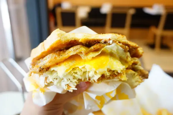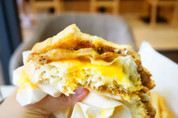 夾高麗菜絲、半熟蛋、起司片和豬排