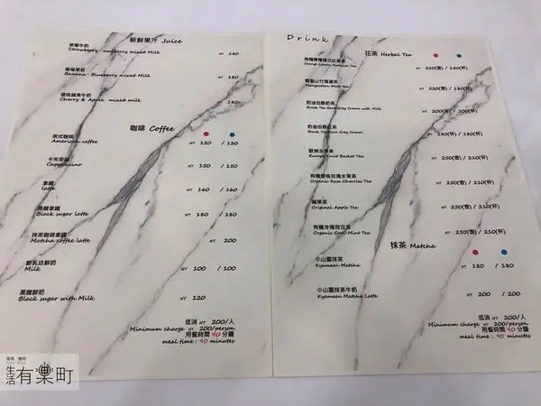 菜單上主要是飲品,想吃什麼蛋糕可以直接到櫃台點,飲品有新鮮果汁、德國農莊有機草本花茶、咖啡、風味鮮奶和抹茶,每個人低消為200元;用餐時間為40分鐘。