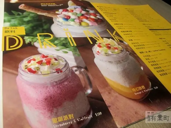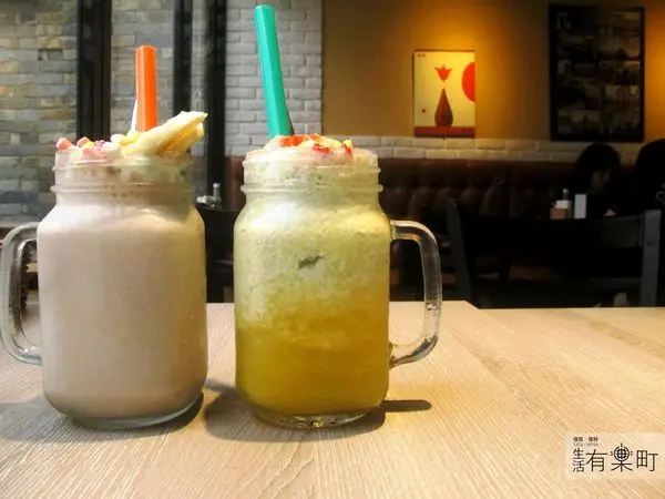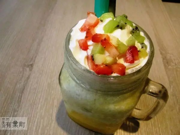 點了奶昔和健康鮮果優格冰飲,奇幻旅澄的鮮黃色澤看起來十分搶眼,綜合柳橙與奇異果兩種水果冰沙,喝起來酸酸甜甜,甜度不高,算是冰涼解膩的口感。