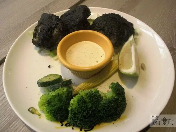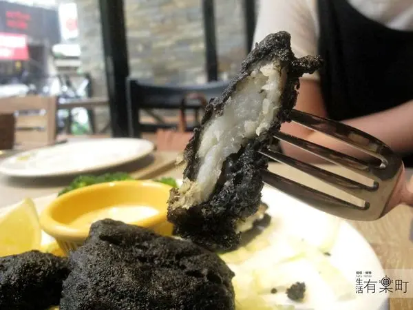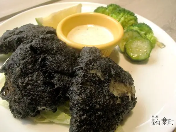炸黑魚以新鮮生菜鋪底搭配清爽花椰菜時蔬,分量適中。小份的有三塊,大份的五塊,可以依據聚餐人數選擇。黑壓壓的炸魚塊可不是炸過頭焦黑掉,而是裹上墨魚汁再下鍋炸,才會黑成這樣,看起來很酷吧~