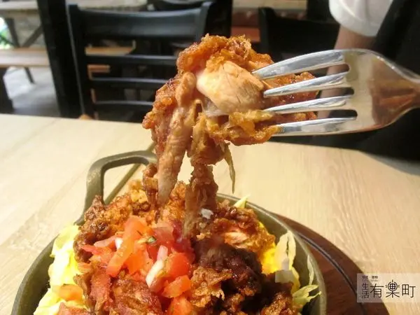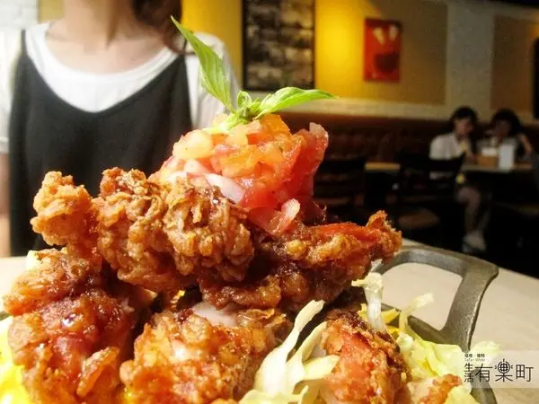 一上桌就讓我驚艷,不僅炸雞香氣四溢,炸雞上頭還鋪滿一球蕃茄丁點綴,像個小盆栽一般可愛,鮮豔色澤看了也很開胃呀。