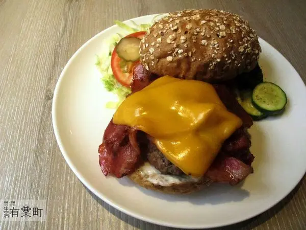 爆漿小肥牛漢堡可做單層與雙層,可依個人胃口選擇,選了單層牛肉,搭配美生菜、酸黃瓜、蕃茄片、煙燻培根、巧達起司等配料,層層疊的模樣看起來就很有飽足感。巧達鹹香起司搭鮮嫩多汁牛肉就是美味保證呀!牛肉吃起來十分紮實嫩口,濕潤多汁搭配起司或是脆培根都很好吃喔。