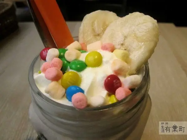 除了喜歡香蕉奶昔的口感,繽紛的視覺效果也好討喜!上頭撒上了好多彩色的mm巧克力和小巧棉花糖,還有搭配餅乾和奶油調味。香蕉奶昔十分香濃,喝起來口感微甜順口,還蠻好喝的喔。