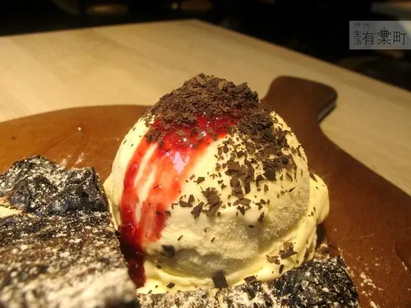 飯後甜點是起司布朗尼冰淇淋,熱呼呼的布朗尼蛋糕搭配一球大大香草冰淇淋,淋上野莓醬和巧克力碎片,盤面上還有焦糖醬點綴,看起來很誘人,而且盛裝的盤子也好可愛呦~