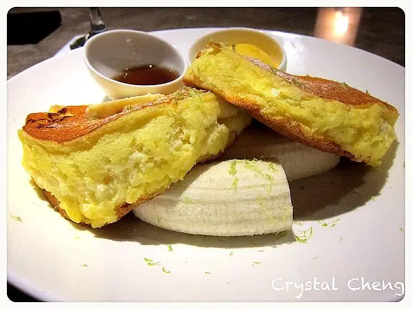 這也是軟呼呼搭配楓糖漿吃,蛋糕下面還有配上新鮮香蕉,很好吃!