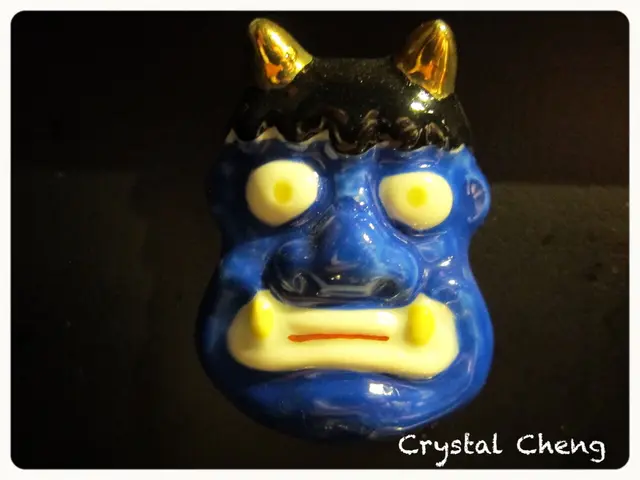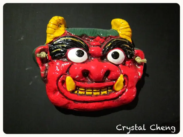 也有黏貼紅藍色鬼面的裝飾於吧檯前方。
