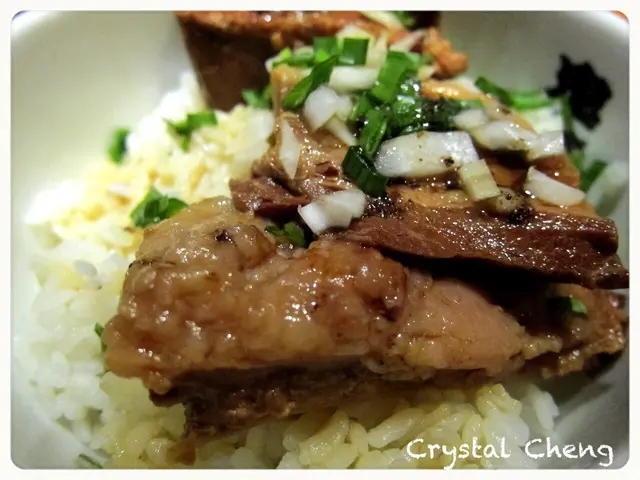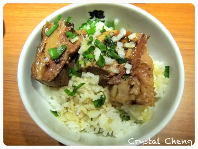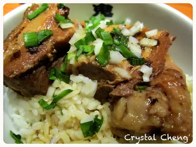 飯上的配料有洋蔥丁跟蔥花,在淋上一點滷汁,