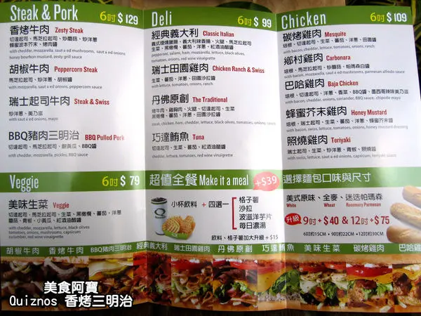 Quiznos的MENU,除了主打招牌的潛艇堡之外,還可以選擇沙拉、湯品、小點心來搭配成套餐。