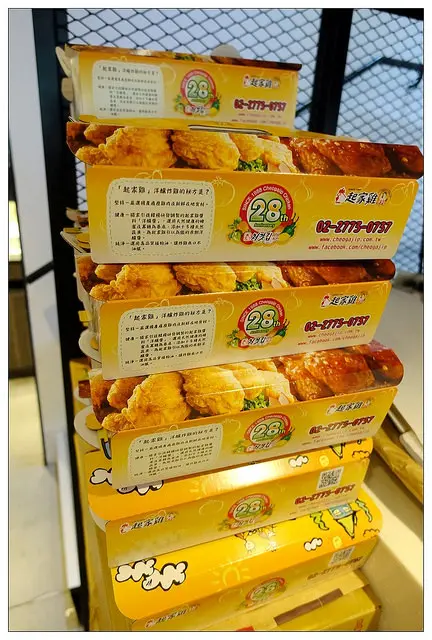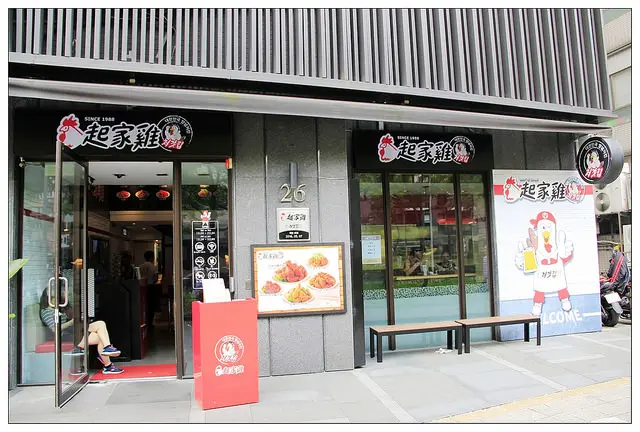 餐廳外觀以沉穩的黑灰色系為主軸~搭配活潑明亮的卡通起家雞圖案相當吸睛