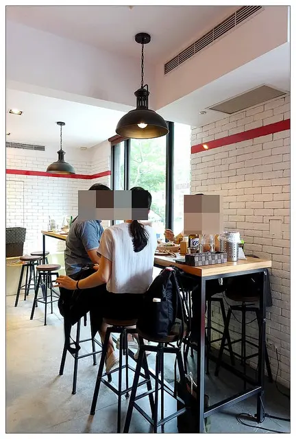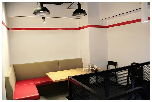 紅白相間帶點美式鄉村風的牆面搭配木質桌面和高腳椅