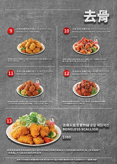 光是全雞就有八種口味不想沾手的懶人們可選去骨炸雞XD