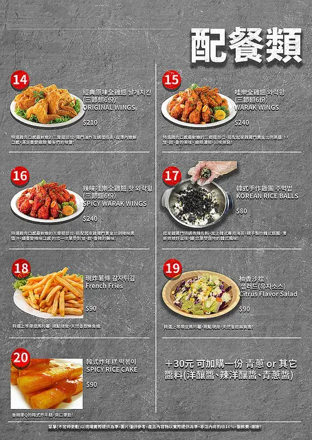 像是雞翅/韓式飯糰/現炸薯條/沙拉/炸年糕等可搭配炸雞一起吃