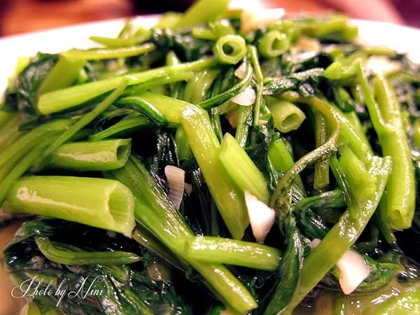 這家常炒青菜加入了蒜頭蔥花爆香,起鍋前加了米酒香氣十足
