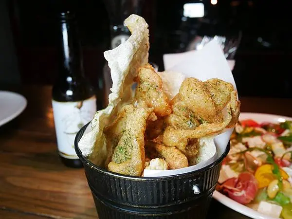 有啤酒當然要來點下酒菜,柏克與奇肯好友這樣組合剛好有做優惠,這炸雞皮跟炸豬皮的口感很特別,大家一定要趁熱吃