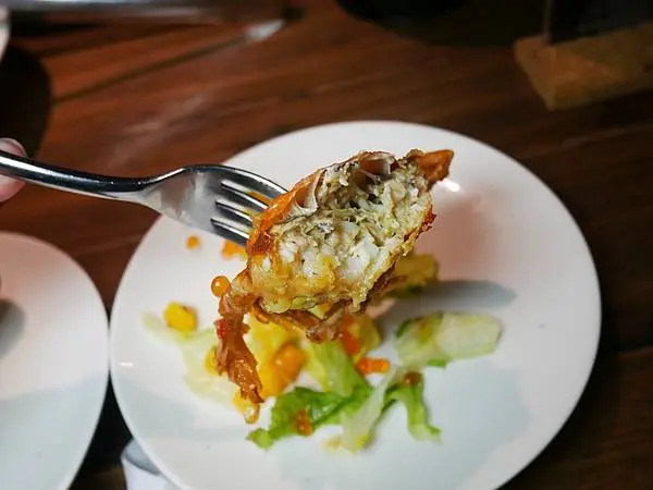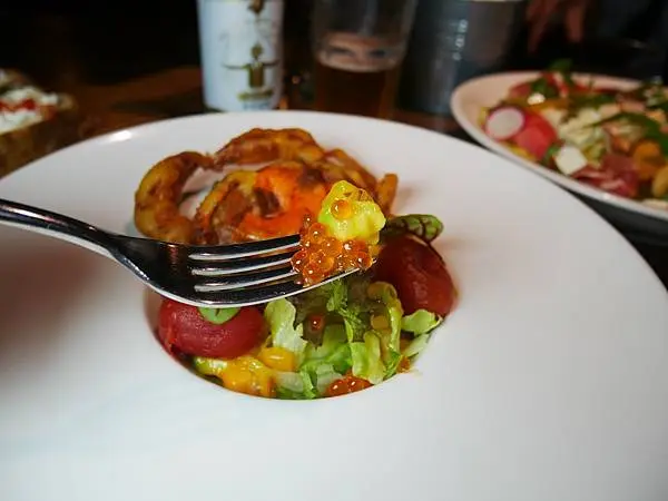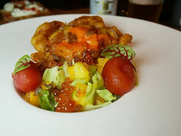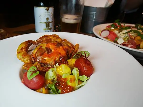 霸氣的軟殼蟹直接躺在沙拉上頭,這裡頭海味滿滿,除了有當季水果芒果跟酪梨外,還有入口一抿就化開的魚卵,