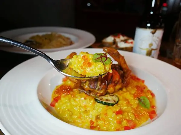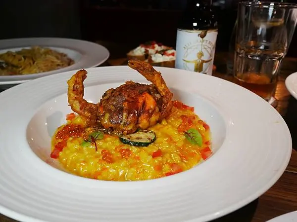 喜歡軟殼蟹的朋友們不能錯過另一款-蟹黃奶油燉飯,一樣是霸氣的擺上一整隻的軟殼蟹,底下則是用蟹黃融入燉飯的美味,