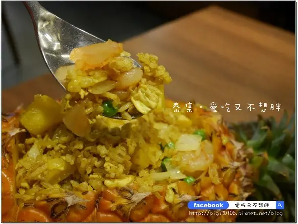 鳳梨炒飯裡頭有黃咖哩,用泰國香米炒出來的飯吃起來粒粒分明,裡頭還有大蝦仁及香腸來增加口感。