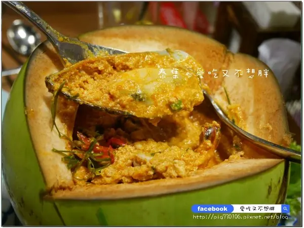 這個很妙,椰子殼容器好有創意,這道是椰汁紅咖哩海鮮