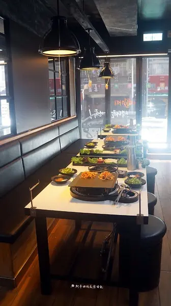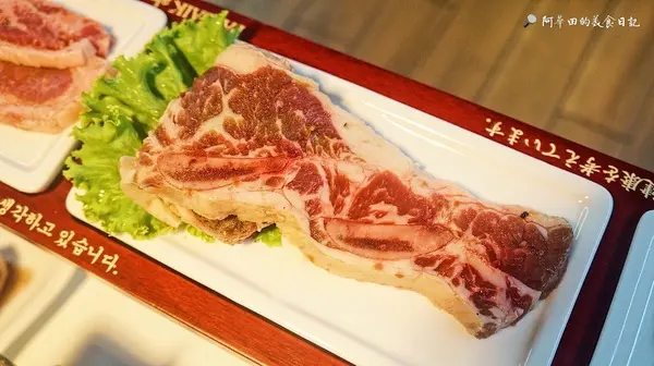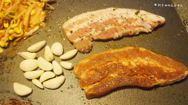 厚切椒鹽豬五花:使用溫體豬,油脂較多,烤至金黃焦脆後再沾取香油胡椒鹽跟黃豆粉,入口香氣十足,整體的口感層次提升了不少,再搭配烤盤上的豆芽跟泡菜,最後再以生菜包覆入口,根本享受至極。