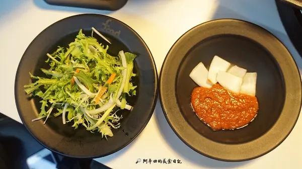 左邊是開胃蔬菜沙拉,右邊的韓式辣醬跟生洋蔥可以搭配著肉吃~
