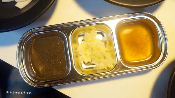 由左至右是芝麻醬、生蒜頭、水梨沾醬,很新穎的沾醬配料