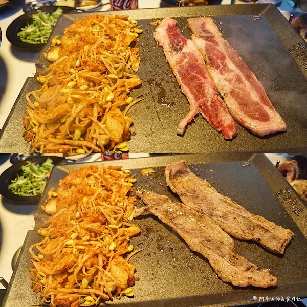 奶油椒鹽牛霜降:烤盤上抹上奶油後,再爽快的把椒鹽牛霜降放上,奶油香立刻飄散出來,霜降牛雖然油脂較肥,但肉質軟嫩富有彈性,突然覺得吃韓式燒肉能吃到牛肉真的好幸福啊!在韓國可是吃不到的呢!
