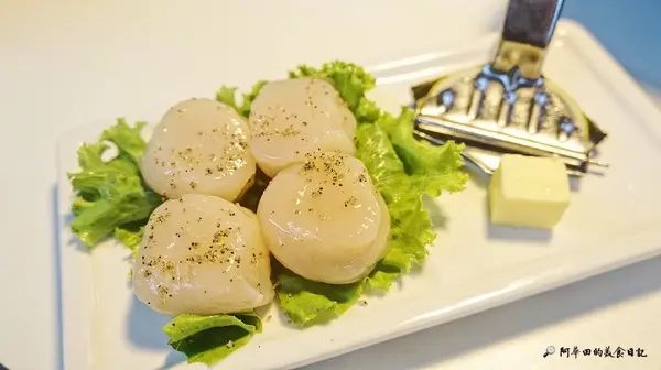嫩煎大干貝$200:四顆大干貝,跟以往的干貝等級不同,新菜單的大干貝是可生食的等級,想必有多新鮮了吧!盤子夾子上的檸檬片沒有使用是因為店經理Michael說非常新鮮,所以不太需要用檸檬片去腥味,烤盤上塗上奶油,再放入大干貝,沒一下次又被奶油的香氣撲鼻而來,表面烤至微焦,約七分熟的口感更能感受到軟嫩多汁,果然經過Michael的巧手後,便知有沒有.由於同行的兩位美女不太敢吃干貝,所以我獨吃了四顆大干貝,實在是爽度破表啊!