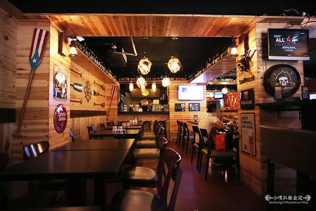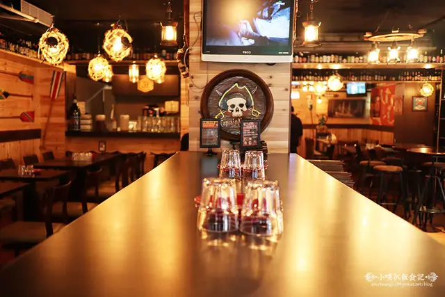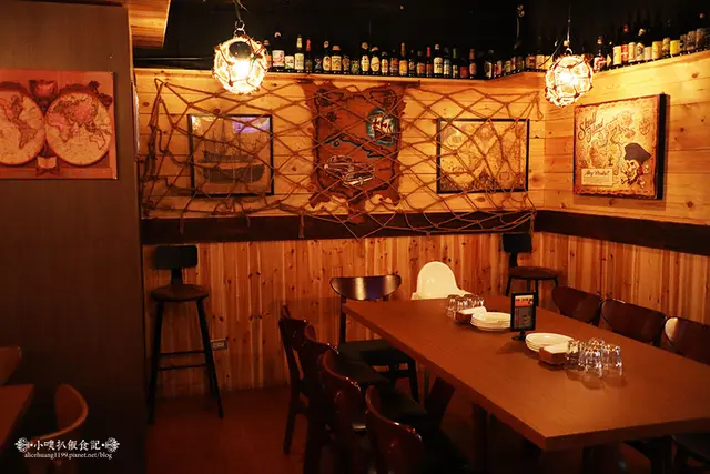 木質的桌椅,搭配暈黃的燈光,配合加勒比海的海盜元素,特別在設置上以低高度的裝潢風格,讓大家宛如置身在船艙一般
