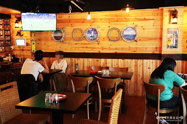 店內的風格以各式木材與水密窗裝飾打造成船艙的氛圍,現場燈飾再營造出船裡酒吧的整體氛圍