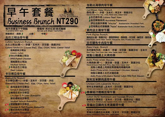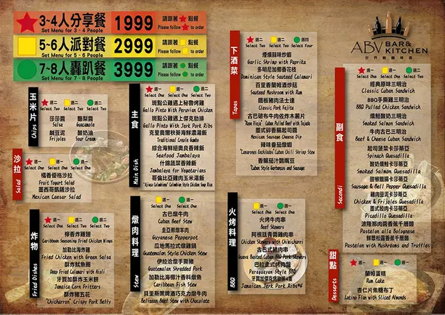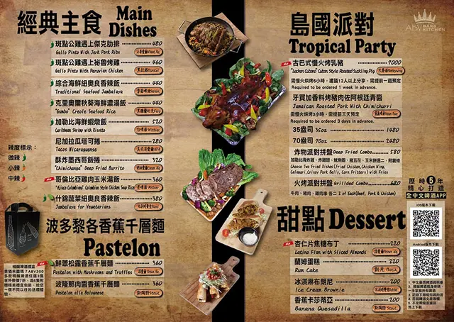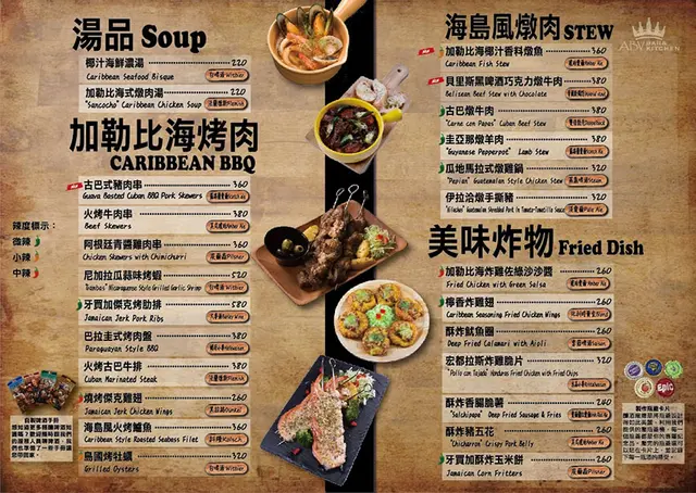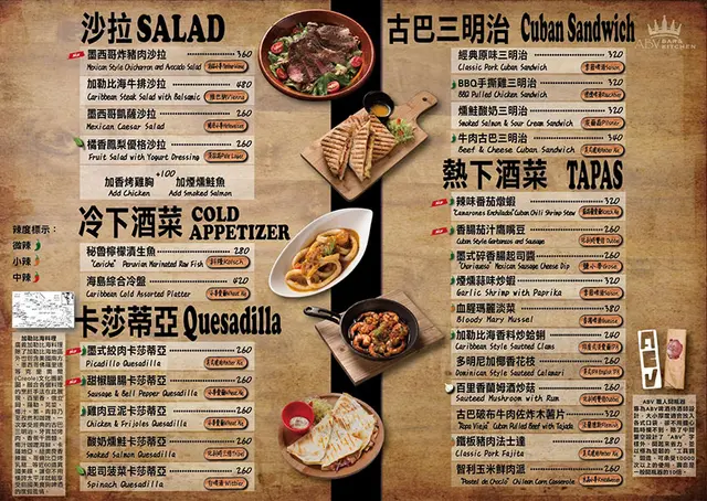 *菜色有:沙拉.古巴三明治.卡莎蒂亞.Tapas.海島風燉肉.加勒比海烤肉.串烤.炸物.主食.千層麵.湯品.冷下酒菜.甜點