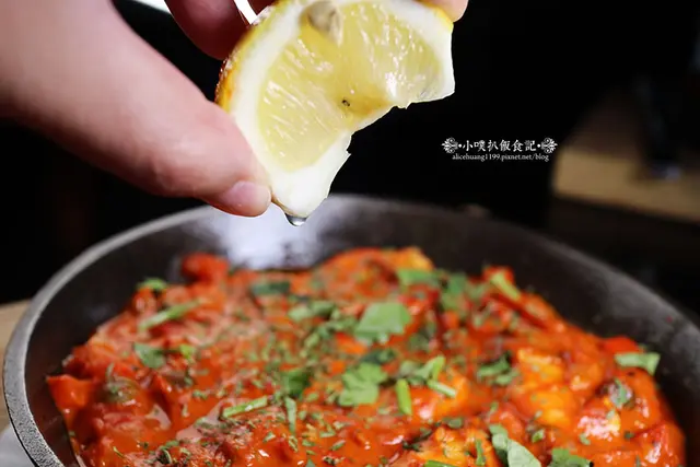 搭配淋上新鮮的檸檬汁,醬汁中有濃郁的清新酸味蕃茄醬,淋入的檸檬汁增添清爽開胃的酸度,搭配大量的香菜及綜合辛香料,口感酸酸辣辣的,抹一些店家附的切片長棍麵包,口感真是一級棒!!!