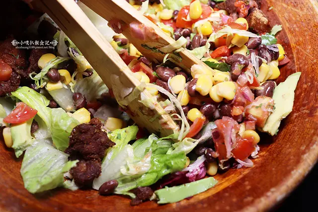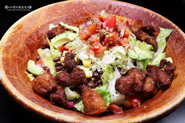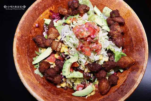 墨西哥式的前菜沙拉,以新鮮的酪梨、番茄、紅椒、玉米、黑豆、香菜等食材,拌入以低溫油炸的五花肉塊