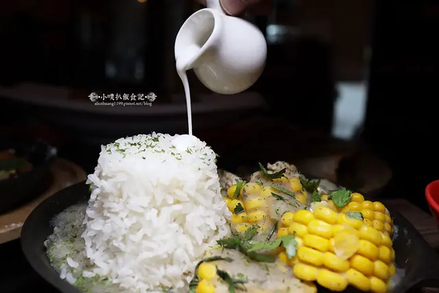 之後將一旁附的鮮奶油及酸豆加入湯飯中,混和拌勻所有食材,米飯選擇道地泰國香米,口感Q軟並充滿米香,浸泡在湯汁中,混和手撕甘甜的雞胸肉及玉米、酪梨