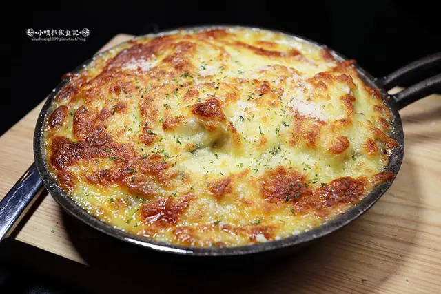 這道鮮蕈松露香蕉千層麵,融合了洋菇、杏鮑菇、鴻喜菇,以底部鋪上眾多蕈菇,再於上層鋪上松露,最後於表面鋪上起司,進行焗烤