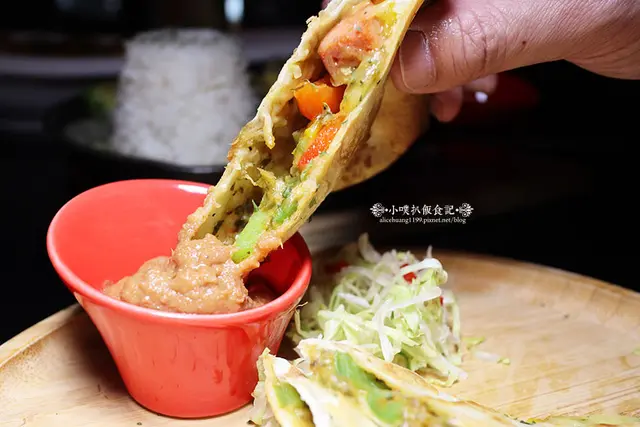搭配店家自製的豆泥沾醬,將甜椒臘腸卡莎蒂亞沾附一點,有適度中和濃厚起司的膩口感