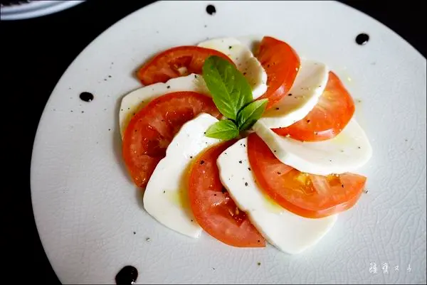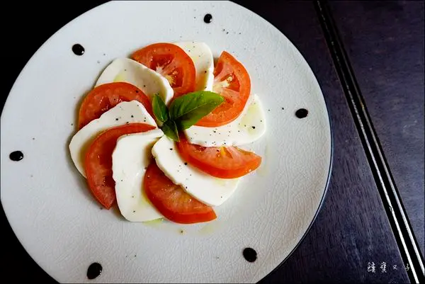 以番茄與起司切片擺盤,淋上些許橄欖油,整體雖簡單卻又好看。