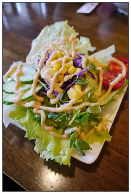 沙拉內容還蠻豐富的~~小番茄、黃瓜、玉米、豆芽、紫高麗菜絲...疊得像座小山一樣XD