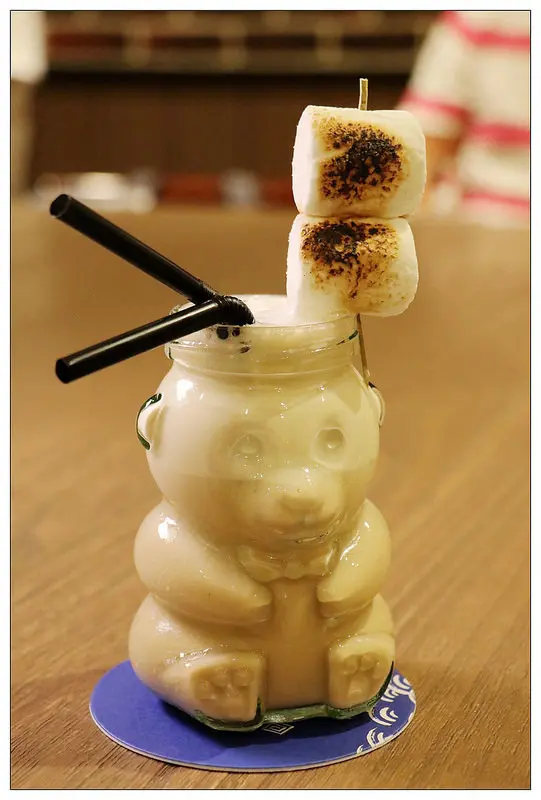 超可愛的小熊玻璃杯上還有兩顆烤過的棉花糖