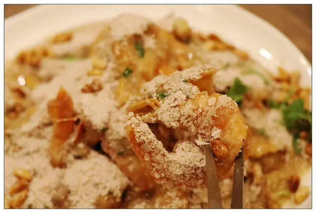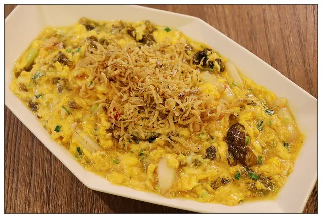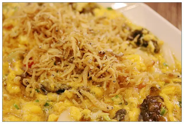 這道將雨來菇加入了蛋和蟹肉快炒.上方還放上了酥炸吻仔魚