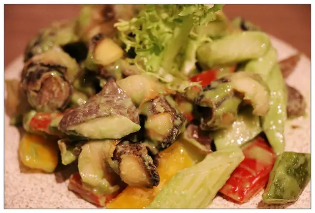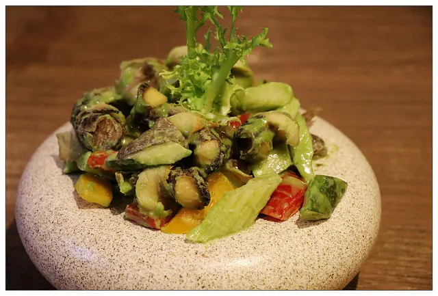 使用了脆彈的海螺肉沾裹日式芥末再搭配紅黃椒及西洋芹