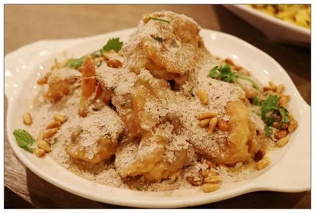 在酥炸過的脆彈鮮蝦上灑滿起司.香滑芋泥及松子