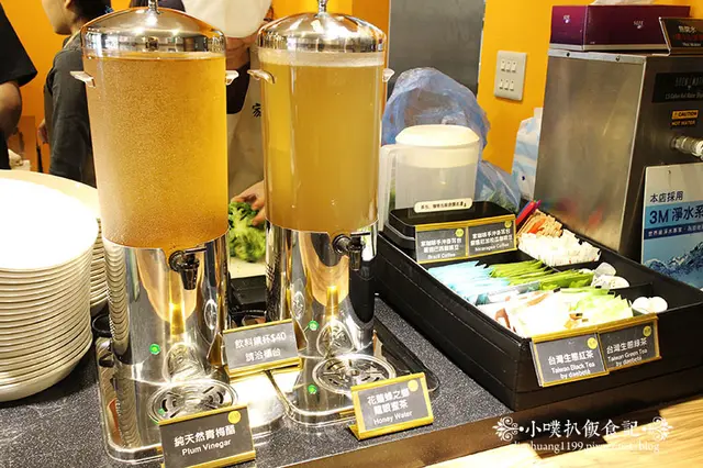 飲料採自助式(飲料續杯$40),有純天然青梅醋及花蓮蜂之鄉龍眼蜜茶.台灣生態紅茶.台灣生態綠茶.家咖啡手沖掛耳包嚴選巴西咖啡豆(無糖).家咖啡手沖掛耳包嚴選尼加拉瓜咖啡豆(無糖),我選擇純天然青梅醋,口味順口好喝,青梅醋甘甜有酸度,很大推喔!!!