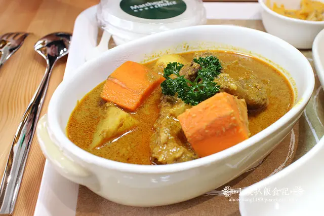 峇里牛板腱咖哩:色澤較深紅一些,加入薑黃.南薑.香茅及椰汁等獨特香料,讓咖哩色香味俱全,紅蘿蔔大塊切塊,我本來不喜歡紅蘿蔔的,但是"家咖哩"的紅蘿蔔沒有生味,感覺是新鮮甜味融入在咖哩醬汁中,馬鈴薯大塊不會太過於濕軟,口感鬆軟綿密,呈現食材的天然好味道!!!
